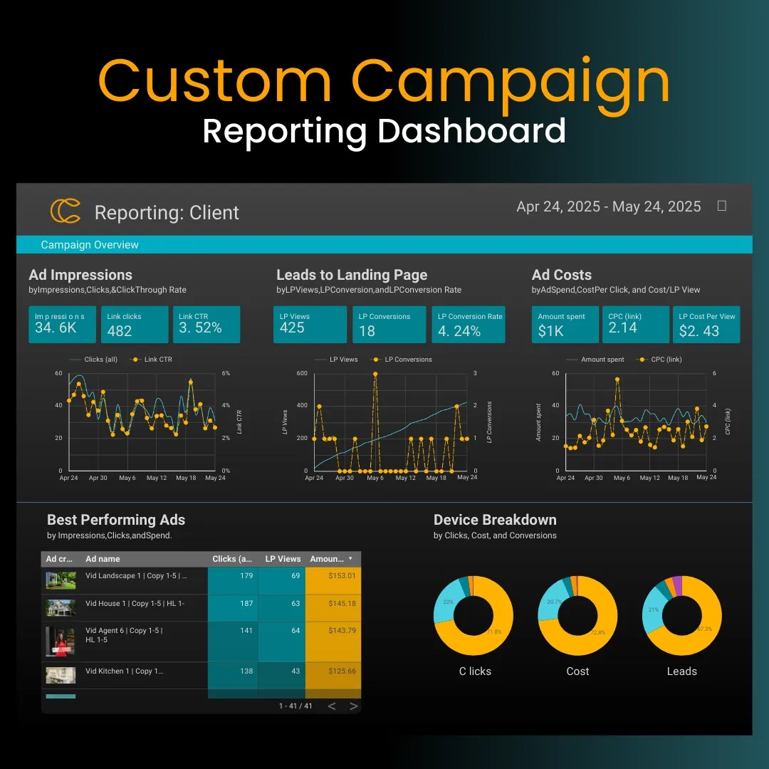 Our Custom Reporting Dashboard gives you a clear, real-time view of your campaign performance. See leads, ad results, and ROI all in one place—so you can make confident decisions and keep your growth on track.